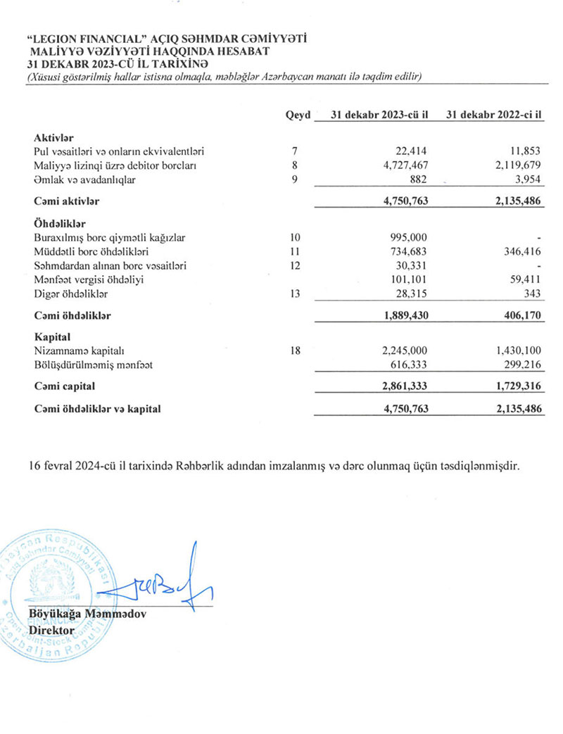 Ötən il "Legion Financial" şirkətinin maliyyə lizinqi portfeli 2 milyon 608 min manat və ya 2,2 dəfə artaraq 31 dekabr 2023-cü il tarixində 4 milyon 727 min manata çatıb. Şirkətin maliyyə lizinqi portfeli 2022-ci ilin sonunda 2 milyon 120 min manat təşkil etmişdi.