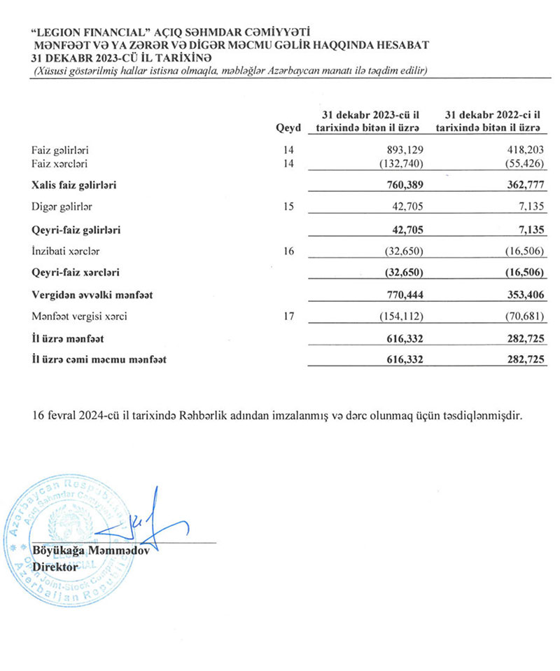 Marja.az xəbər verir ki, "Legion Financial" şirkətinin faiz gəliri 2022-ci ildə 418 min manat ikən, 2023-cü ildə 893 min manata yüksəlib (2,1 dəfə artıb). Ötən il Şirkət təxminən 43 min manat digər gəlirlər də əldə edib (2022-ci ildə 7 min manat).