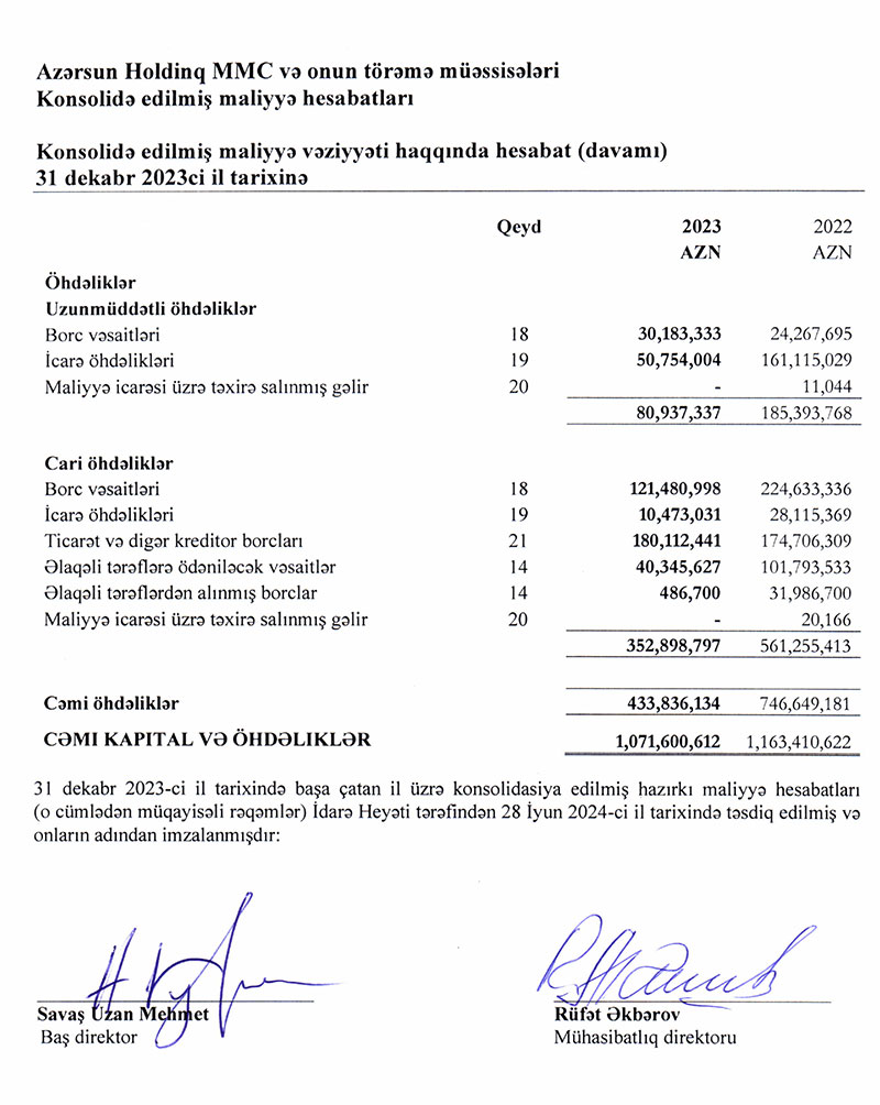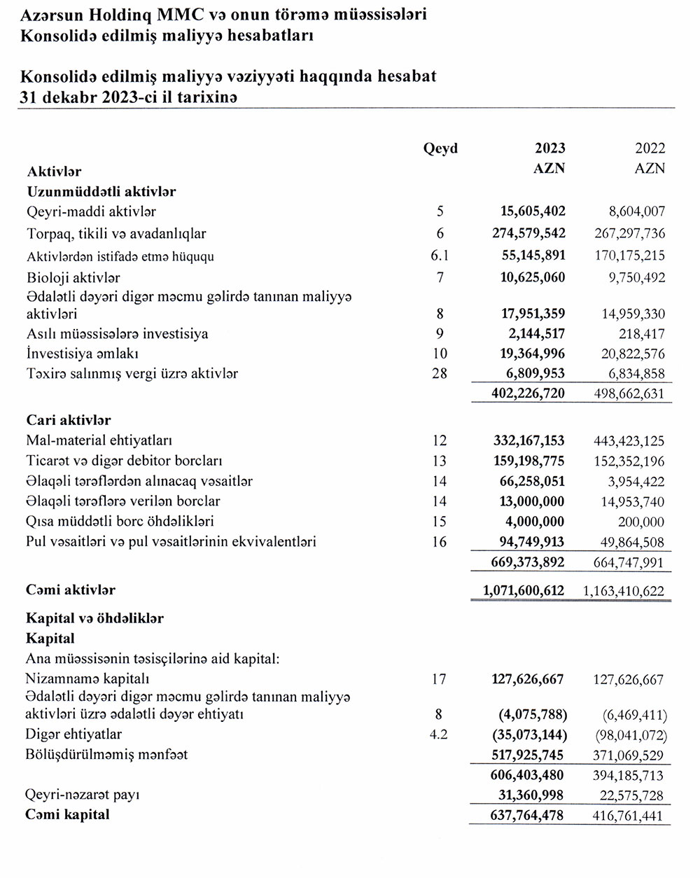 31 dekabr 2023-cü il tarixində qrup 1 milyard 72 milyon manat cəmi aktivlərə malik olub. Qrup 2022-ci ilin sonunda 1 milyard 163 milyon manat cəmi aktivlərə malik idi.