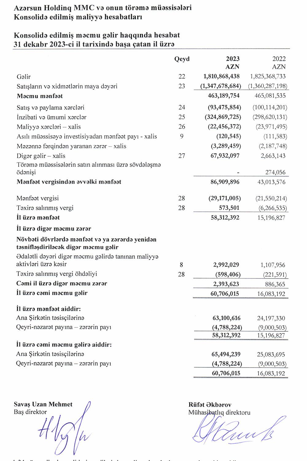 Qrup 31 dekabr 2023-cü il tarixində 518 milyon manata yaxın bölüşdürülməmiş mənfəətə malik olub.