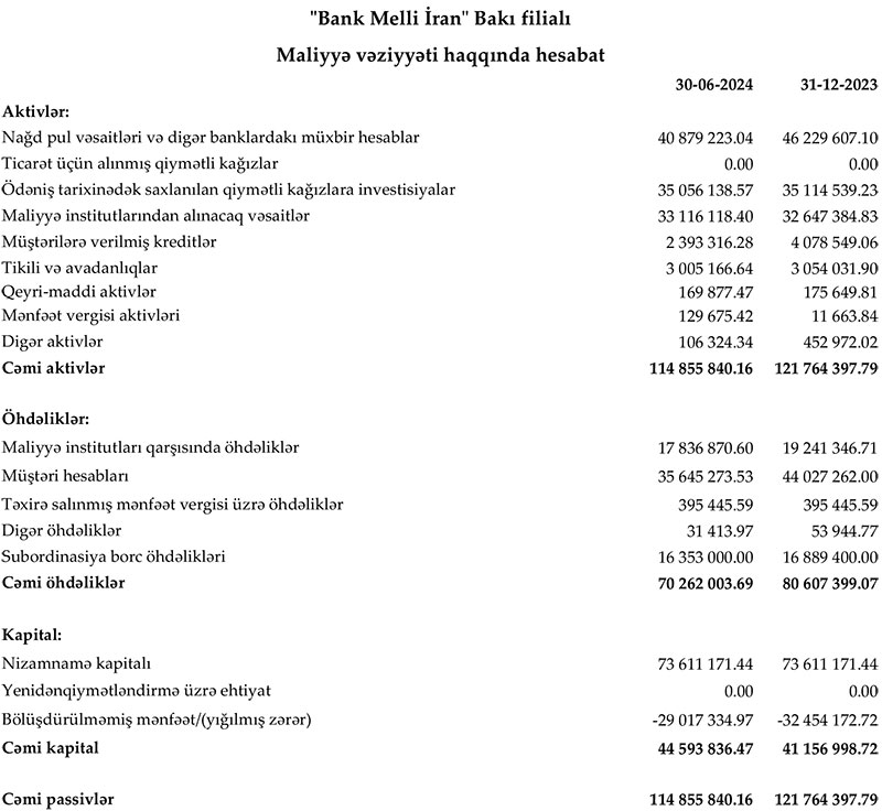 30 İyun 2024-cü il tarixində "Bank Melli İran" Bakı filialı 114 milyon 856 min manat cəmi aktivlərə malik olub. Cəmi aktivlərin, o cümlədən 35 milyon 56 min manatını qiymətli kağızlara investisiyalar, 33 milyon 116 min manatını maliyyə institutlarından alınacaq vəsaitlər və 2 milyon 393 min manatını müştərilərə verilmiş kreditlər təşkil edib. Nağd pul vəsaitləri və digər banklardakı müxbir hesablar 46 milyon 229 min manatdan 40 milyon 879 min manata gerilədiyi üçün Filial ilk 6 ayda kiçilib.