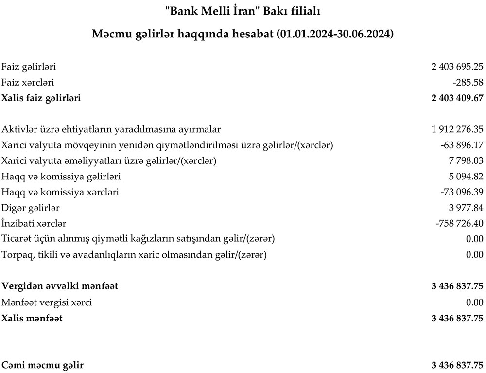 "Bank Melli İran" Bakı filialı 2024-cü ilin ilk 6 ayını (yanvar-iyun) 3 milyon 437 min manat xalis mənfəət ilə başa vurub. Filial 2023-cü ilin eyni dövrünü 2 milyon 84 min manat xalis mənfəət ilə bağlamışdı. Beləliklə, "Bank Melli İran" Bakı filialının xalis mənfəəti 1 milyon 354 min manat və ya 65% artıb. Xalis mənfəətin artması Bankın faiz gəlirlərinin və ehtiyatdan qayıdan vəsaitin artması ilə əlaqədardır.