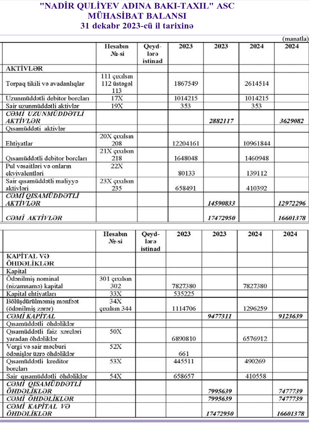31 Dekabr 2023-cü il tarixində "Bakı Taxıl" ASC 17 milyon 473 min manat cəmi aktivlərə malik olub.