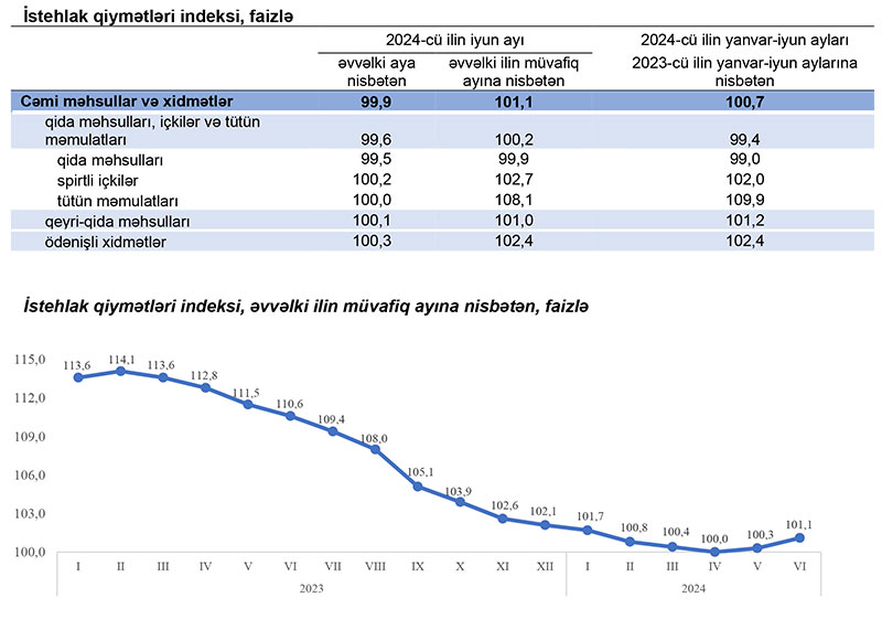Dövlət Statistika Komitəsinin yaydığı məlumata görə, 2024-cü ilin iyun ayında istehlak qiymətləri indeksi əvvəlki aya nisbətən 0,1 faiz azalıb, yanvar-iyun aylarında isə əvvəlki ilin müvafiq dövrünə nisbətən 0,7 faiz artıb.