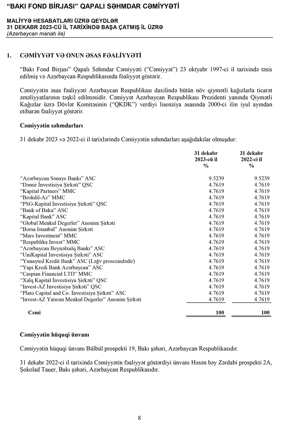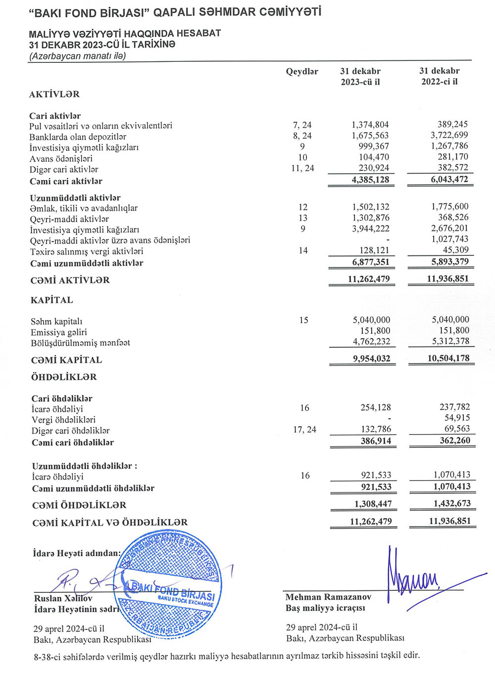 31 dekabr 2023-cü il tarixində "Bakı Fond Birjası" QSC 11 milyon 262 min manat cəmi aktivlərə malik olub. QSC 2022-ci ilin sonunda 11 milyon 937 min manat cəmi aktivlərə malik idi.