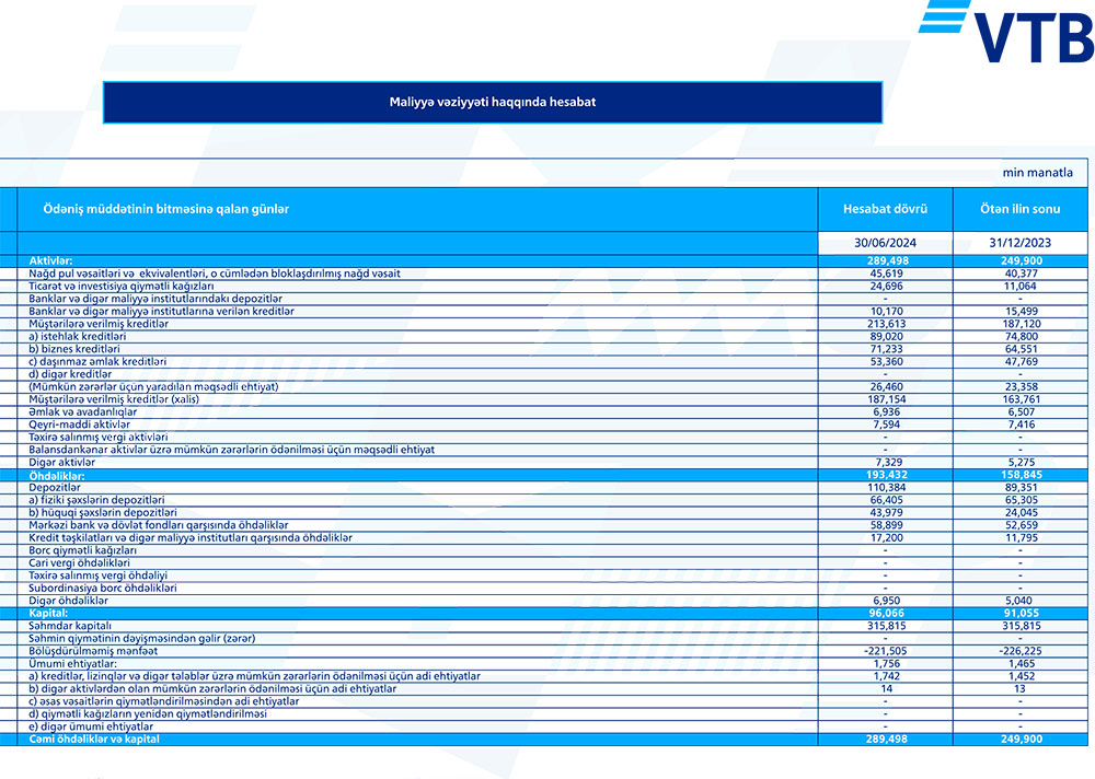 İlk yarımildə "Bank VTB (Azərbaycan)"ın cəmi aktivləri 39 milyon 598 min manat və ya 15,8% artaraq 30 iyun 2024-cü il tarixində 289 milyon 498 min manat təşkil edib. 31 dekabr 2023-cü il tarixində Bankın cəmi aktivləri 249 milyon 900 min manata çatmışdı.