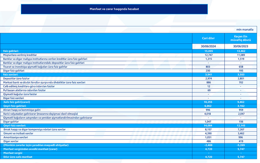 Rusiya kapitallı "Bank VTB (Azərbaycan)" ASC 2024-cü ilin birinci yarısını (yanvar-iyun) 4 milyon 720 min manat xalis mənfəət ilə başa vurub. Bank 2023-cü ilin eyni dövrünü 5 milyon 747 min manat xalis mənfəət ilə bağlamışdı. Xalis mənfəəti azalması mümün zərərlər üçün yaradılan ehtiyatdan qayıdan vəsaitin bu il daha az olması ilə əlaqədardır. Cari hesabat dövründə "Bank VTB Azərbaycan" böyüyüb, gəlirləri artıb.