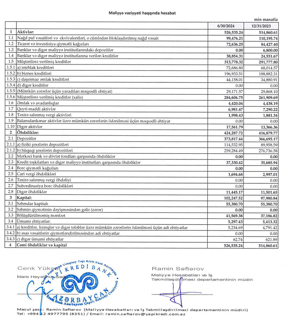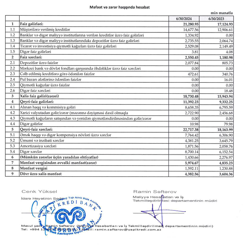 "Yapı Kredi Bank Azərbaycan" 2-ci rübü 4.4 milyon manat xalis mənfəətlə başa vurdu