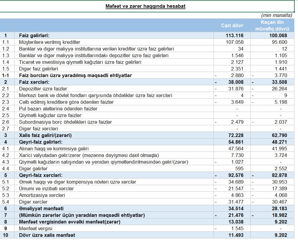 Müqayisə üçün qeyd edək ki, 2023-cü ilin ilk 6 ayı ərzində “ Unibank”ın cəmi əməliyyat gəlirləri 148 milyon 339 min manat, cəmi əməliyyat xərcləri 120 milyon 156 min manat təşkil etmişdi.