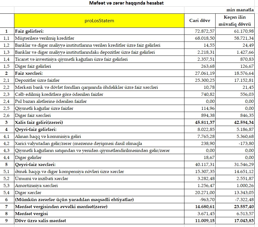 Eyni zamanda, 2024-cü ilin ilk 6 ayında mümkün zərərlər üçün yaradılan məqsədli ehtiyatlardan azad olan 964 min manat mənfəətə əlavə olunub və vergidən əvvəlki mənfəəti 14 milyon 681 min manata yüksəlib. 2023-cü ilin ilk 6 ayında ehtiyatdan azad olan 7 milyon 322 min manat mənfəətə əlavə edilmiş və vergidən əvvəlki mənfəət 23 milyon 557 min manata yüksəlmişdi.