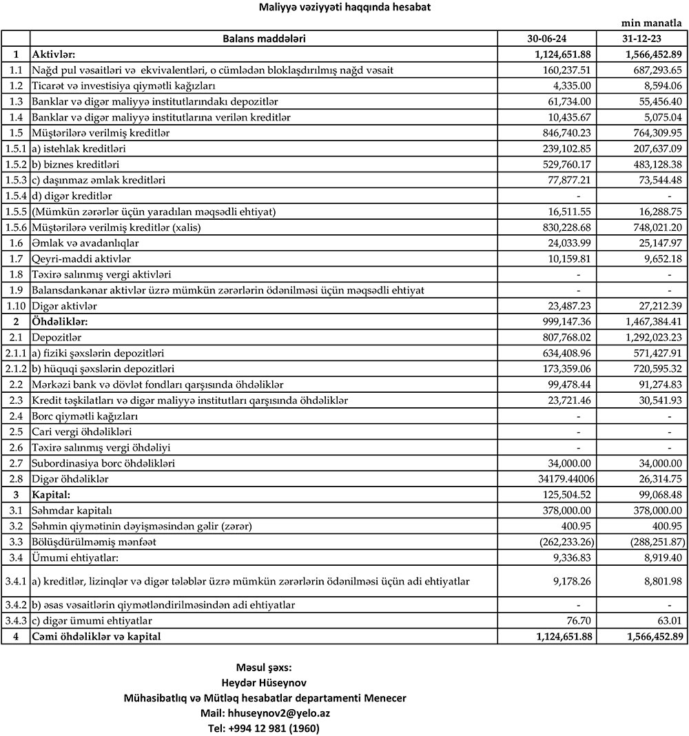 2024-cü ilin ilk 6 ayı ərzində "Yelo Bank”da cəmi depozitlər 484 milyon 255 min manat və ya 37,5% azalaraq 807 milyon 768 min manata geriləyib. O cümlədən, Bankda fiziki şəxslərin depozitləri 62 milyon 981 min manat artaraq 634 milyon 409 min manata yüksəlib, hüquqi şəxslərin depozitləri isə 547 milyon 236 min manat azalaraq 173 milyon 359 min manata geriləyib.