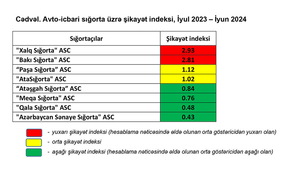 Azərbaycan Mərkəzi Bankı İyul 2023 – İyun 2024 dövrü üzrə Avto-icbari sığorta üzrə şikayət indeksini açıqlayıb.