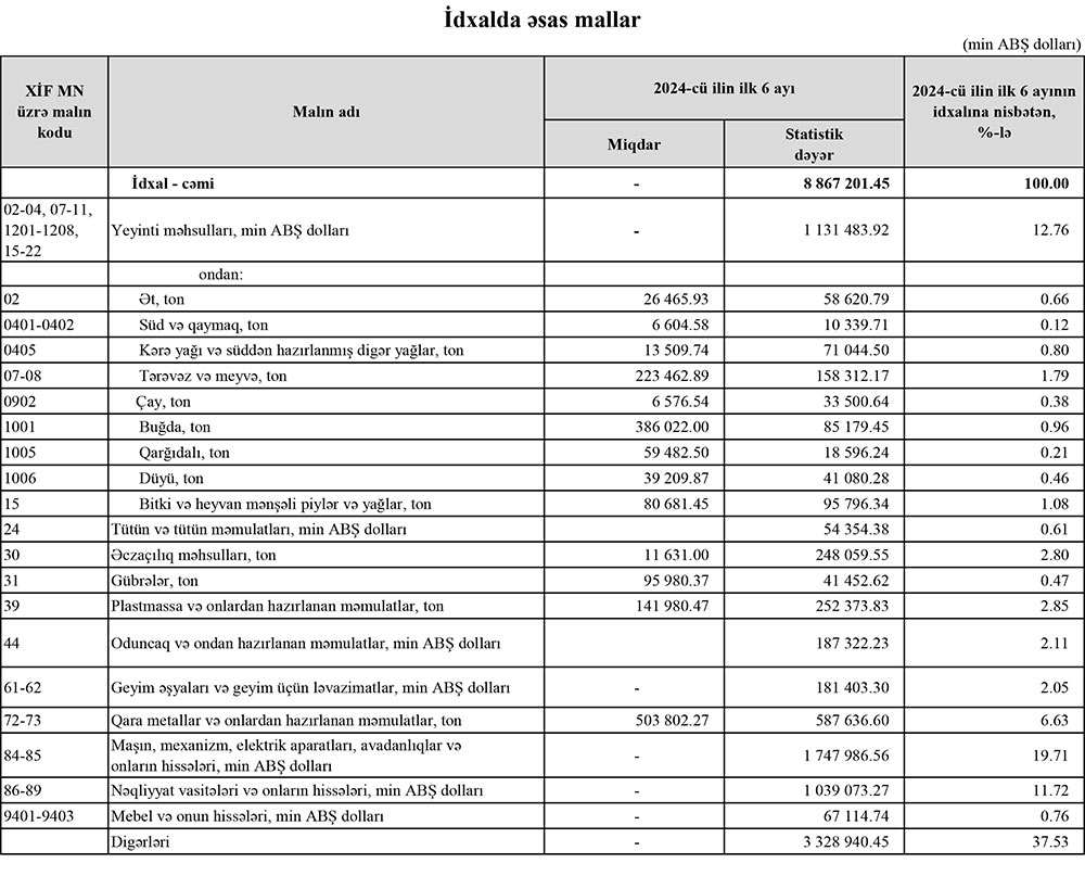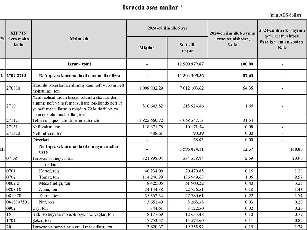2024-cü ilin yanvar-iyun dövründə Azərbaycanın ən çox ixrac və idxal etdiyi mallar.