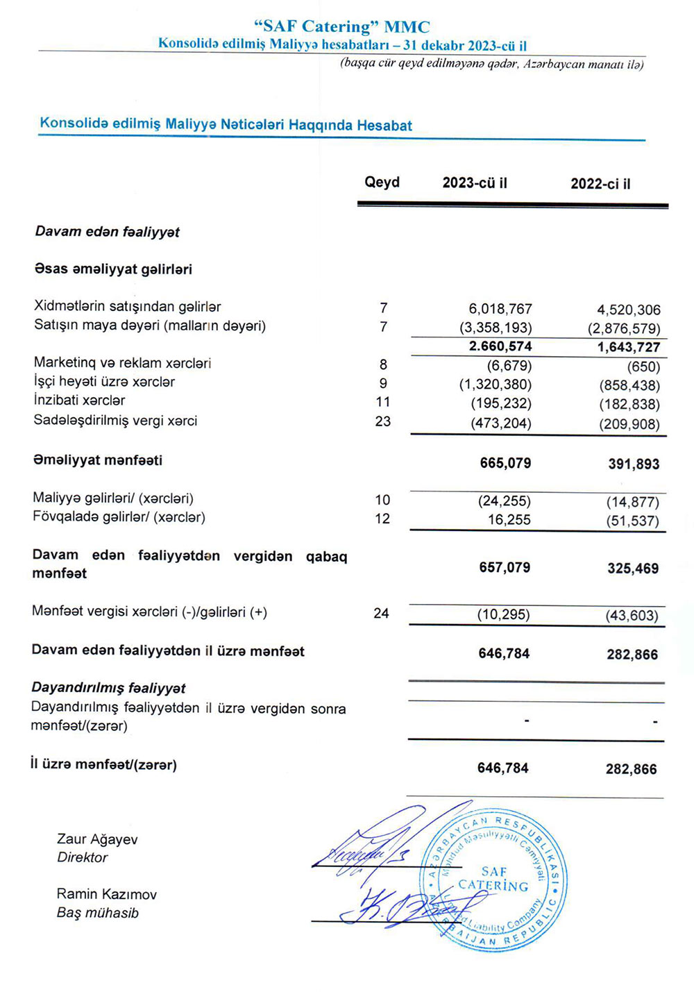 Marja.az xəbər veri ki, "SAF Catering" şirkətinin əsas əməliyyat gəliri (satış) 2022-ci ildə 4 milyon 520 min manat ikən, 2023-cü ildə 6 milyon 19 min manata yüksəlib (1 milyon 499 min manat və ya 33,2% artıb).