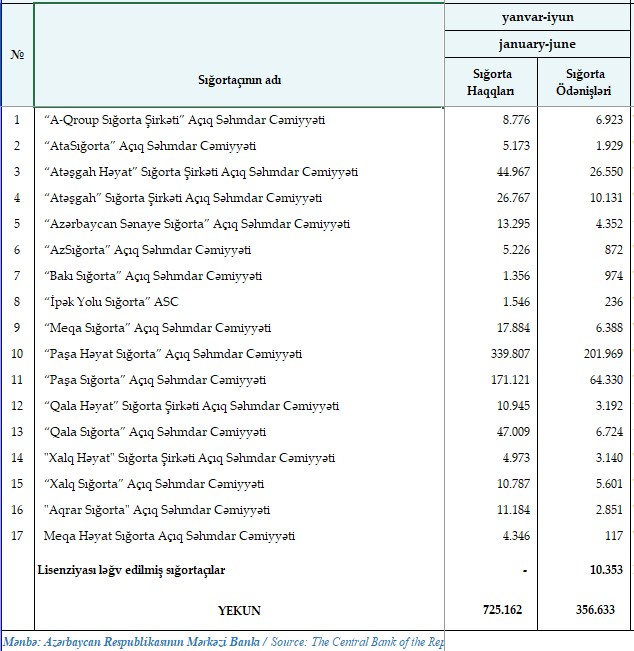 2024-cü ilin yanvar-iyun dövründə (ilk 6 ayda) Azərbaycanın sığorta şirkətləri tərəfindən 725 milyon 162 min manat sığorta haqları hesablanıb, 356 milyon 633 min manat sığorta ödənişləri həyata keçirilib.