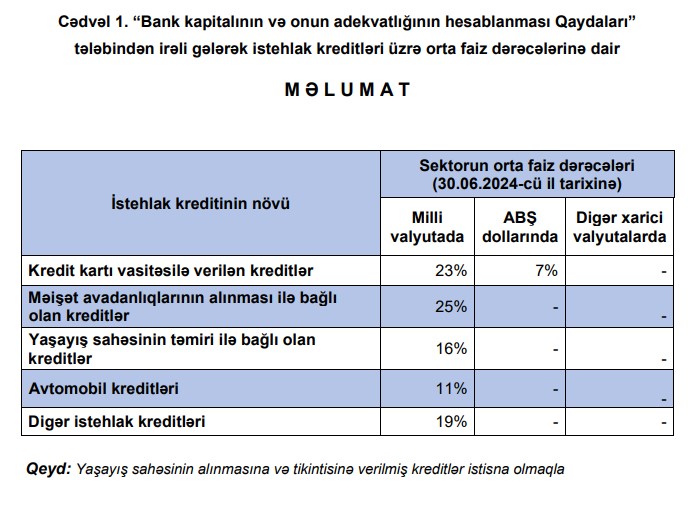 Orta faiz dərəcəsi kredit kartı vasitəsilə verilən kreditlər üzrə 25%-dən 23%-ə, yaşayış sahəsinin təmiri ilə bağlı olan kreditlər üzrə 21%-dən 16%-ə, avtomobil kreditləri üzrə 12%-dən 11%-ə düşüb. Orta faiz dərəcəsi məişət avadanlıqlarının alınması ilə bağlı olan kreditlər üzrə 24%-dən 25%-ə yüksəlib.Azərbaycan Mərkəzi Bankı “Bank kapitalının və onun adekvatlığının hesablanması Qaydaları” tələbindən irəli gələrək istehlak kreditləri üzrə orta faiz dərəcələrinə dair məlıumat açıqlayıb.