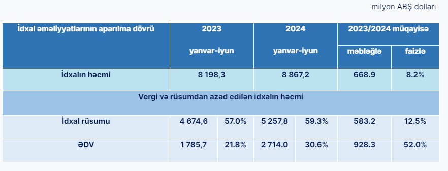 Ötən ilin müvafiq dövrü ilə müqayisədə 2024-cü ilin yanvar-iyun aylarında idxalın həcmi 668,9 milyon ABŞ dolları və ya 8,2 faiz artsa da, gömrük daxilolmaları kontekstində idxalın tərkib komponentində adekvatlıq müşahidə olunmur.