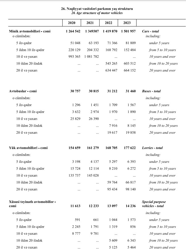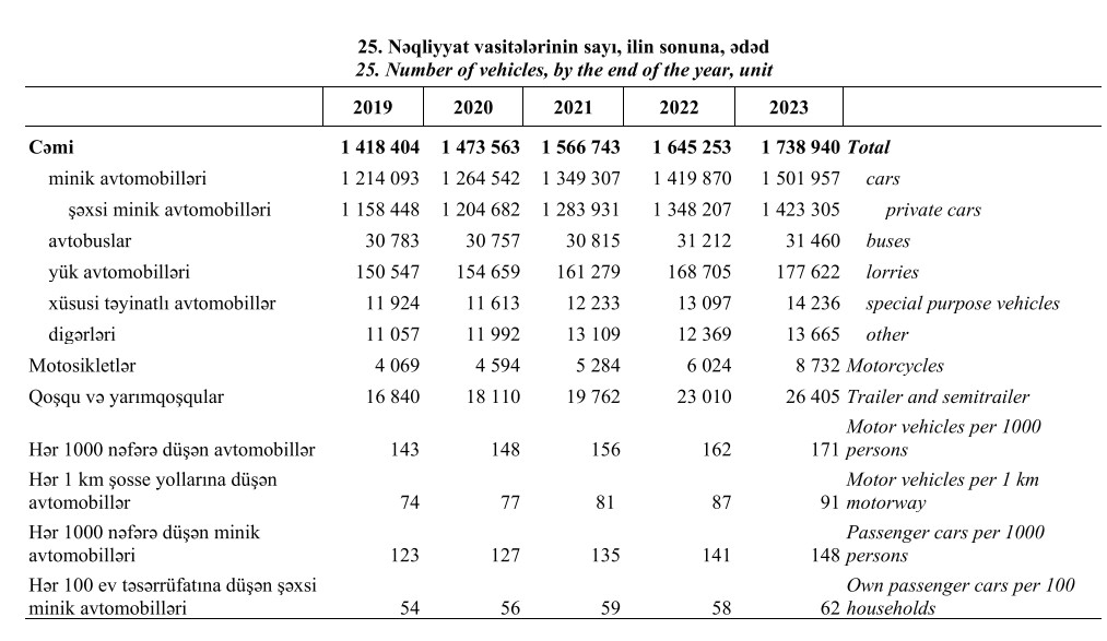 2023-cü ilin sonunda Azərbaycanda nəqliyyat vasitələrinin sayı 1 milyon 738 min 940 ədəd, o cümlədən minik avtomobillərinin sayı 1 milyon 501 min 957 ədəd təşkil edib.
