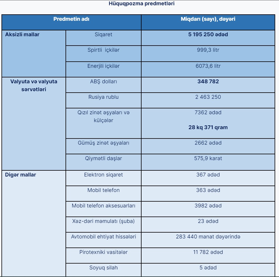 Dövlət Gömrük Komitəsi gömrük orqanlarının hüquq-mühafizə fəaliyyətinin nəticələri barədə məlumatları açıqlayıb.