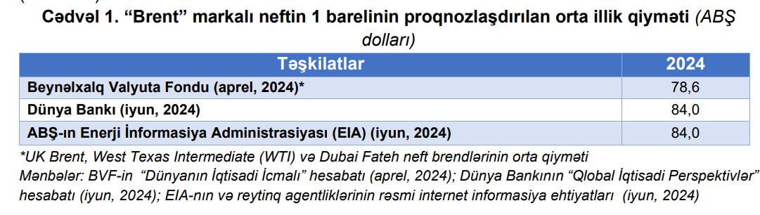 Beynəlxalq maliyyə institutları və agentliklərinin son proqnozlarına əsasən, xam neftin bir barelinin orta illik satış qiymətinin 75,0-85,0 ABŞ dolları civarında olacağı proqnozlaşdırılır