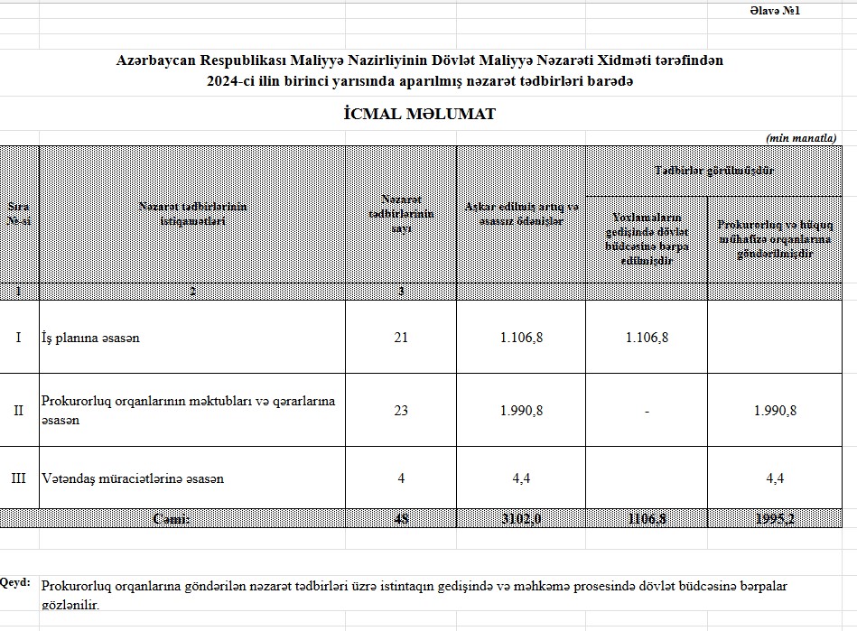 2024-cü ilin birinci yarısında Azərbaycan Respublikası Maliyyə Nazirliyinin Dövlət Maliyyə Nəzarəti Xidməti tərəfindən dövlət büdcəsindən vəsait alan 48 təşkilatda nəzarət tədbirləri həyata keçirilib, 3 milyon 102 min manat artıq və əsassız ödənişlər aşkar edilib.