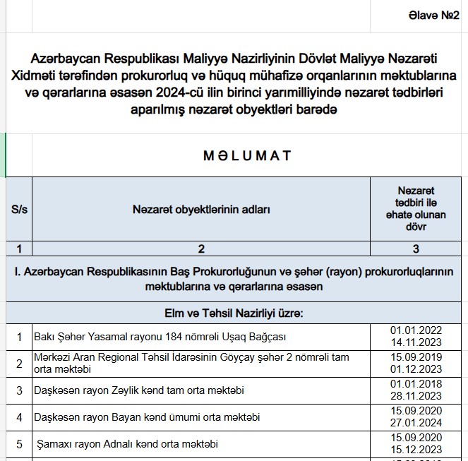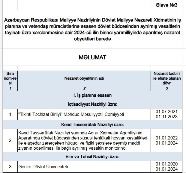 Maliyyə Nazirliyinin Dövlət Maliyyə Nəzarəti Xidməti tərəfindən 2024-cü ilin birinci yarısında aparılmış nəzarət tədbirləri haqqında məlumat