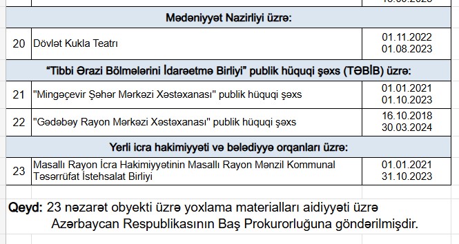 Marja.az Maliyyə Nazirliyinə istinadən xəbər verir ki, hesabat dövründə Xidmətin fəaliyyətinin əsas hissəsini Azərbaycan Respublikası Baş Prokurorluğundan daxil olmuş məktub və qərarların icrası ilə əlaqədar nəzarət tədbirlərinin aparılması təşkil etmişdir. Belə ki, Prokurorluq orqanlarının məktublarına və qərarlarına əsasən 23 təşkilatda yoxlamalar aparılmış, bu yoxlamalarla 1 milyon 990,8 min manat məbləğində artıq və əsassız ödənişlər aşkar edilmiş, yoxlama materialları nöqsanlara hüquqi qiymət verilməsi üçün aidiyyəti üzrə prokurorluq orqanlarına göndərilmişdir (Əlavə N-1 və Əlavə №2).