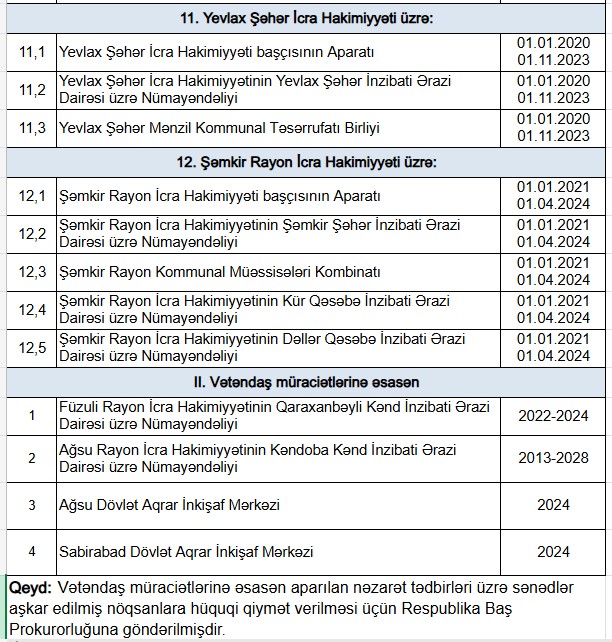 Bundan başqa, Xidmət tərəfindən vətəndaş müraciətlərinə əsasən 4 təşkilatda müraciətlərdə göstərilənlər yoxlanılmış, cəmi 4,4 min manat məbləğində artıq və əsassız ödənişlərə yol verildiyi aşkar olunmuş və yoxlamalarla aşkar edilmiş nöqsanlara hüquqi qiymət verilməsi üçün yoxlamaların nəticələri üzrə tərtib edilmiş sənədlər Azərbaycan Respublikasının Baş Prokurorluğuna göndərilmişdir (Əlavə N-1 və Əlavə №3).