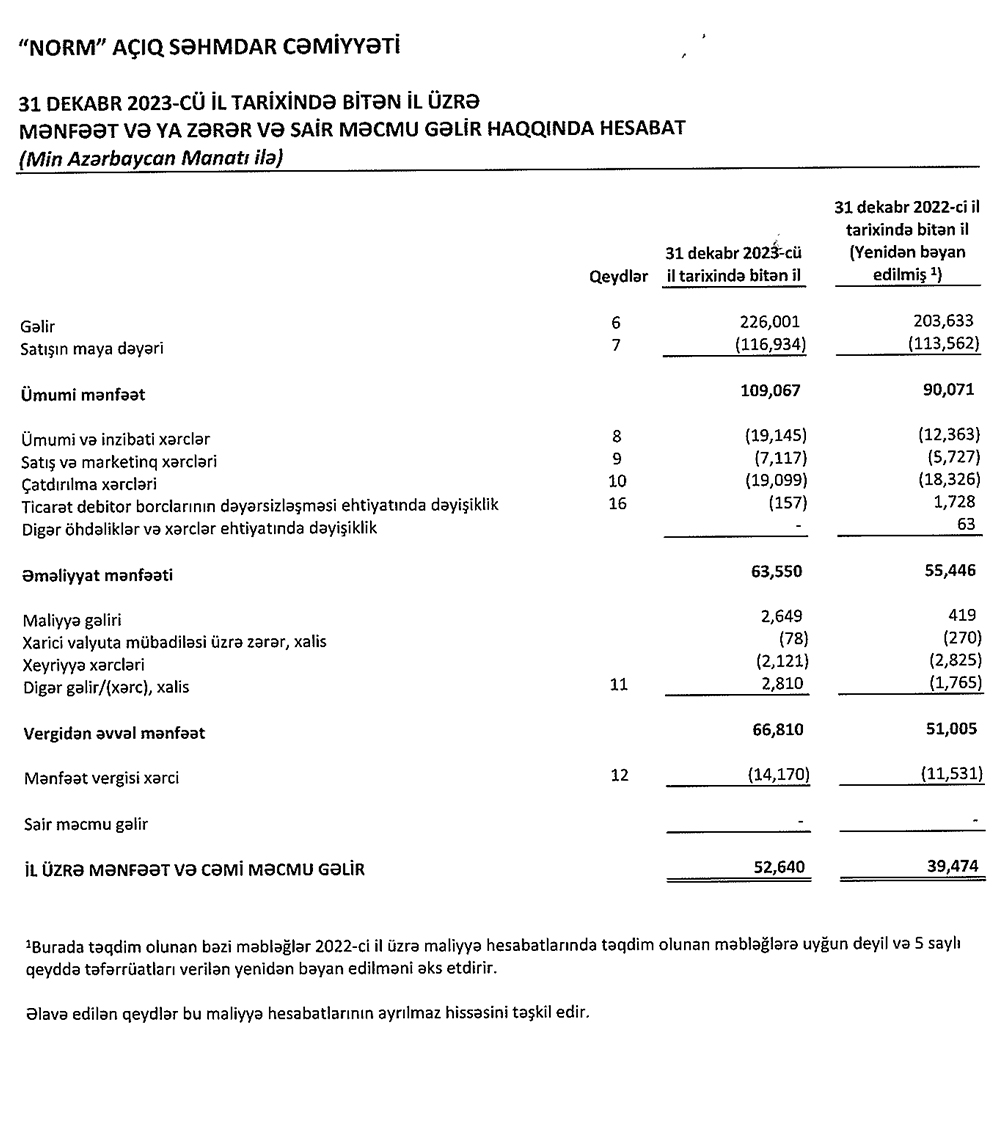 2023-cü ildə "Norm" ASC 2 milyon 649 min manat maliyyə gəlirləri, 2 milyon 810 min manat digər gəlirlər də əldə edib.