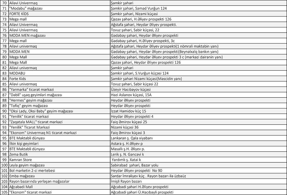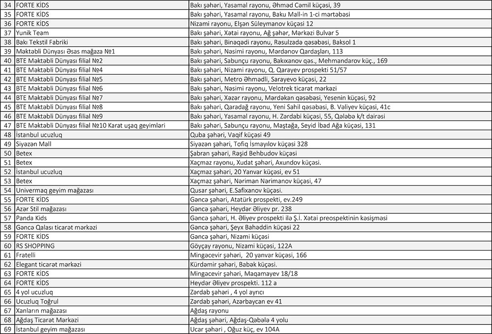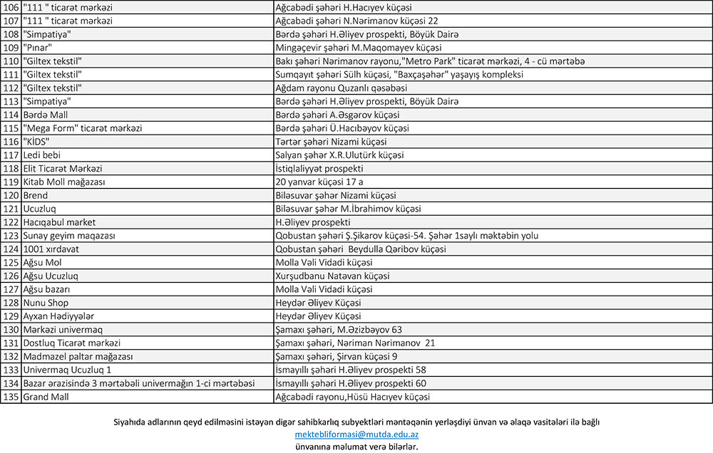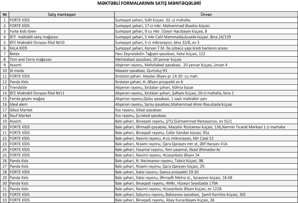 Vahid məktəbli geyimlərinin əldə edilməsinin asanlaşdırılması, əlçatanlığın təmin edilməsi məqsədi ilə vətəndaşlar aşağıda qeyd edilən, eləcə də ölkəmizin şəhər və rayonlarında fəaliyyət göstərən istənilən satış məntəqələrinə müraciət edə bilərlər.