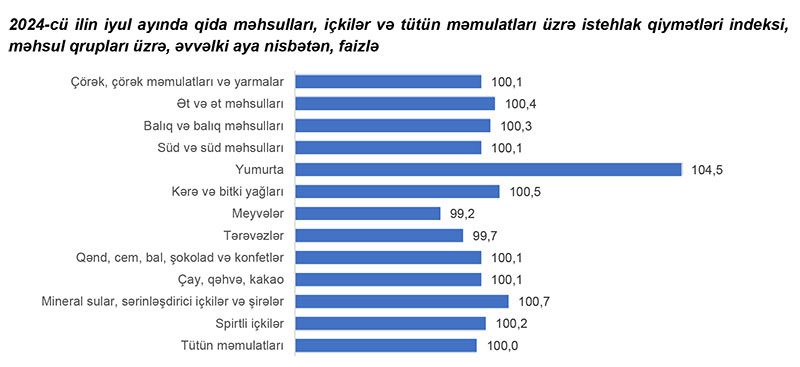 2024-cü ilin iyul ayında qida məhsulları, içkilər və tütün məmulatları üzrə istehlak qiymətləri indeksi əvvəlki aya nisbətən 0,2 faiz artıb, yanvar-iyul aylarında isə əvvəlki ilin müvafiq dövrünə nisbətən 0,3 faiz azalıb.