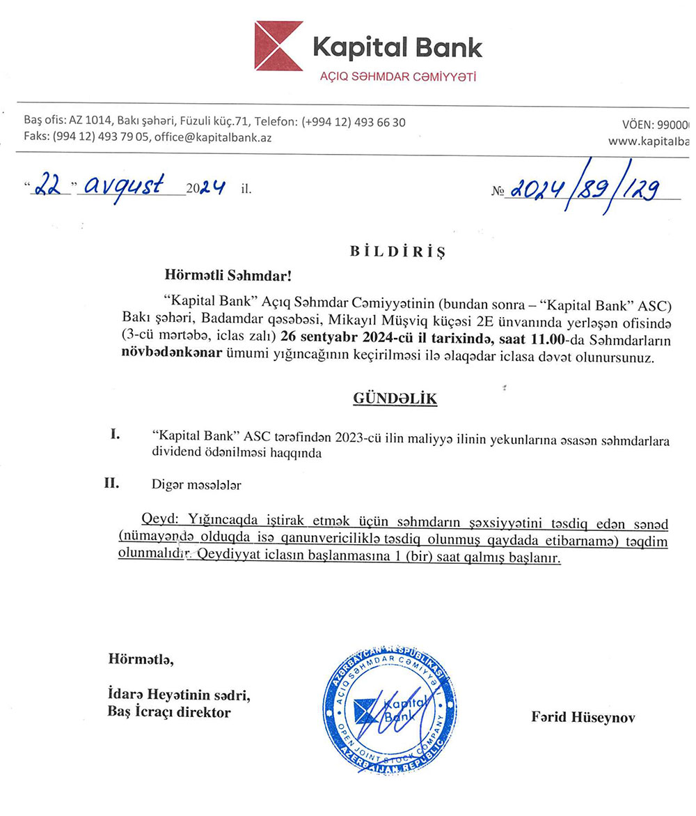 26 sentyabr 2024-cü il tarixində "Kapital Bank" ASC səhmdarlarının növbədənkənar ümumi yığıncağı keçiriləcək.