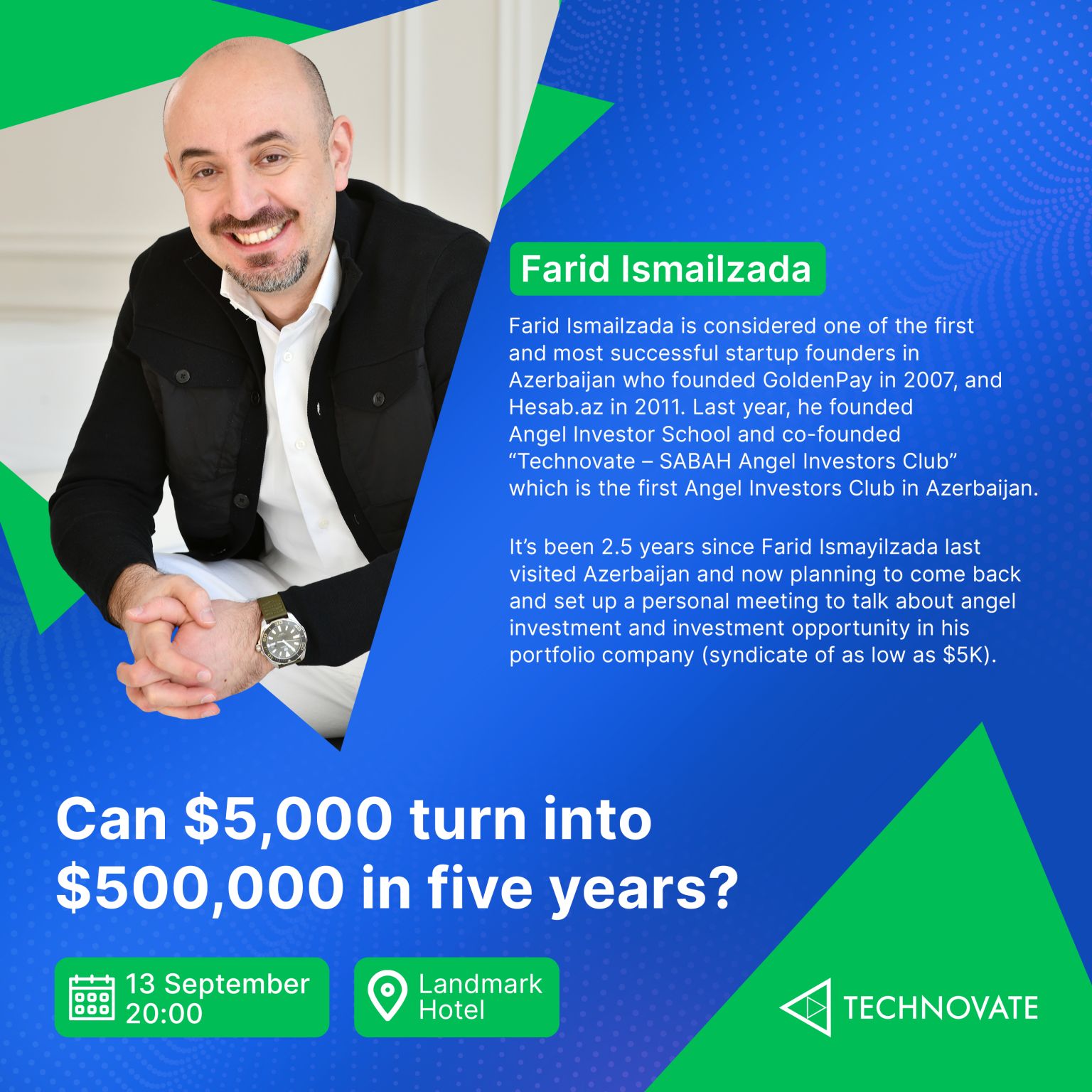 "2,5 ildən sonra bizim Mələk İnvestorlar Klubunun Bakıda keçirməyi planlaşdırdığı "Startup World Cup Azerbaijan Regional" tədbirində iştirak etmək üçün Bakıya gələcəm. Qısa səfər olacaq və məqsədim bu səfəri maksimum faydalı etməkdir. Mələk investisiyalar və hazırda portfelimizdə fandreyzinq edən (könüllü maliyyə tapılması və toplanması prosesi) şirkət barədə danışmaq üçün sizləri görüşə dəvət edirəm. Bu görüş ildə 5-10 min dollar risk edə bilən potensial investorlar üçündür. Startaplarını mənimlə bölüşmək istəyənlər üçün ayrı görüş nəzərdə tutulur".