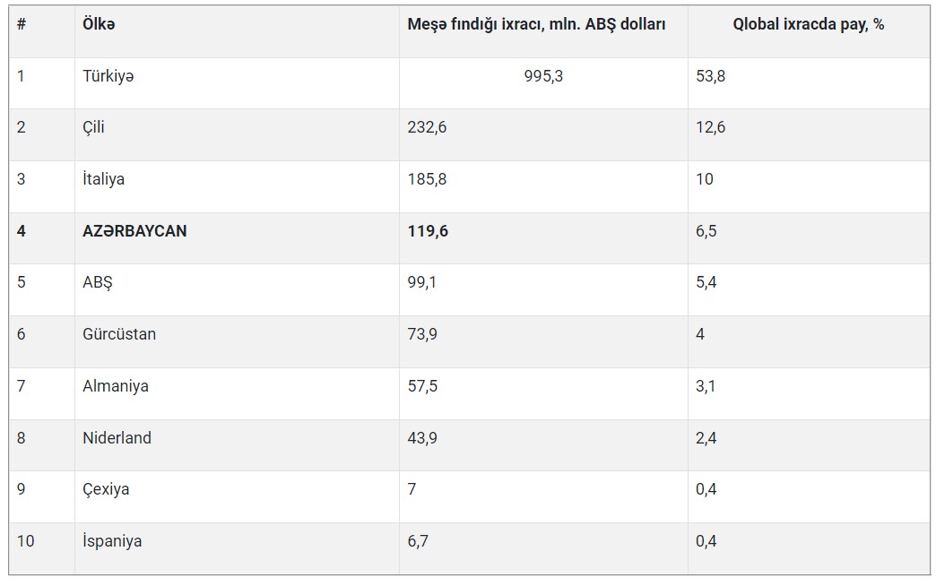 Beynəlxalq Ticarət Mərkəzinin (BMT-nin Ticarət və İnkişaf üzrə Konfransı (UNCTAD) və Ümumdünya Ticarət Təşkilatı ilə birgə mandata malik çoxtərəfli agentlik) 2023-cü il üzrə son məlumatlarına görə, Azərbaycan qlobal meşə fındığı ixracatçıları siyahısında 4-cü yerdə qərarlaşıb.