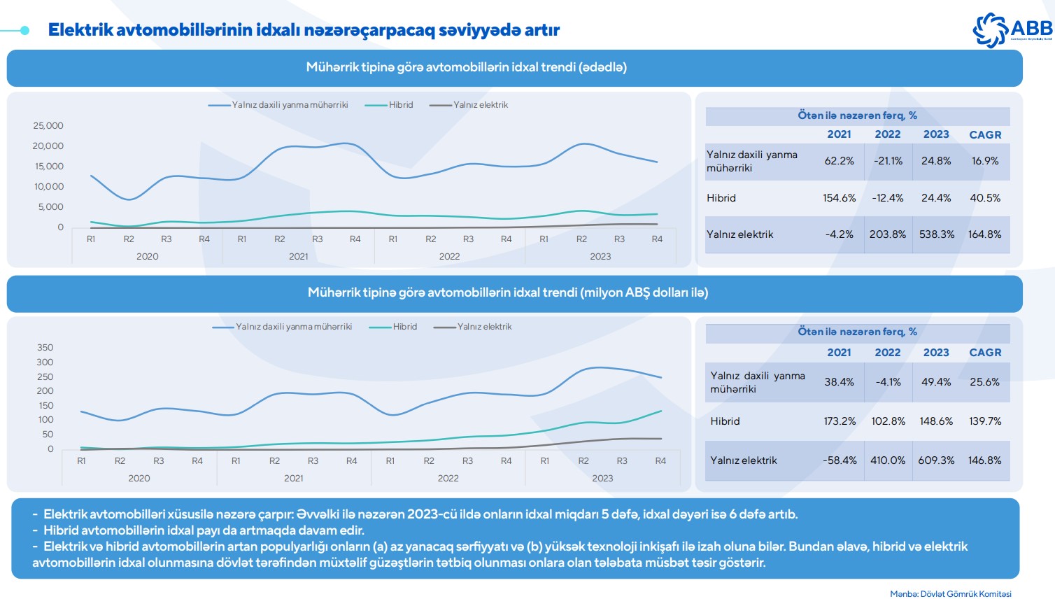 Hesabatda qeyd olunub ki, elektrik avtomobillərinin idxalı nəzərəçarpacaq səviyyədə artıb. Əvvəlki ilə nəzərən 2023-cü ildə onların idxal miqdarı 5 dəfə, idxal dəyəri isə 6 dəfə artıb. Hibrid avtomobillərin idxal payı da artmaqda davam edib.