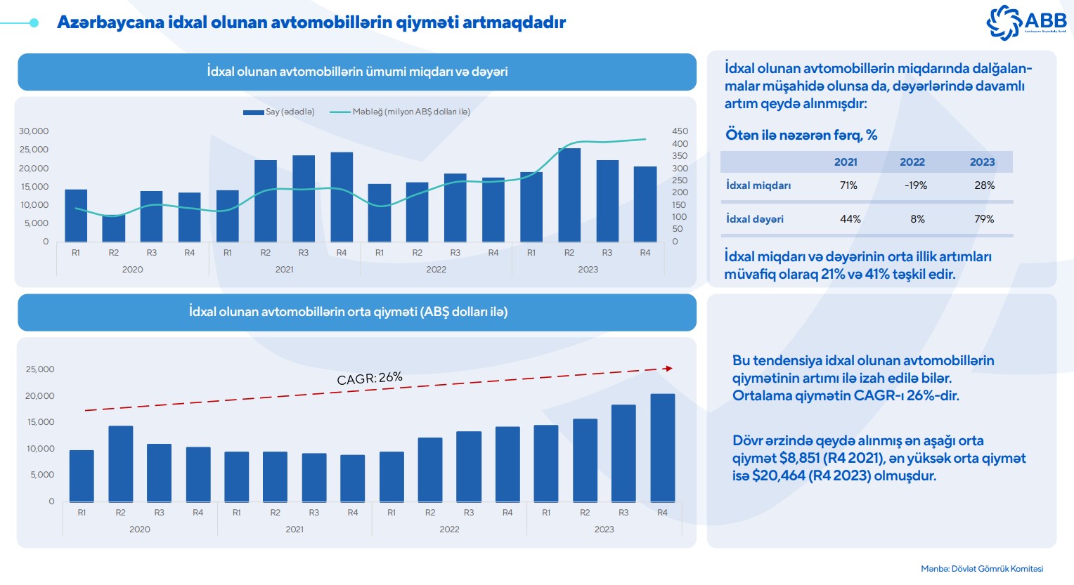 Hesabatda qeyd edilib ki, idxal olunan avtomobillərin miqdarında dalğalanmalar müşahidə olunsa da, dəyərlərində davamlı artım qeydə alınmışdır. Belə ki, avtomobillərin idxal dəyərində 2021-ci ildə 44%, 2022-ci ildə 8% və 2023-cü ildə 79% artım baş verib.