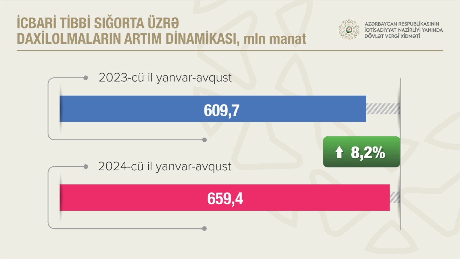 İcbari tibbi sığorta haqları üzrə daxilolmalar ötən ilin eyni dövrü ilə müqayisədə 8,2 faiz artaraq 659,4 milyon manat olub. Qeyri-büdcə təşkilatları üzrə daxilolmalar 9,4 faiz artaraq 468,4 milyon manat təşkil edib.