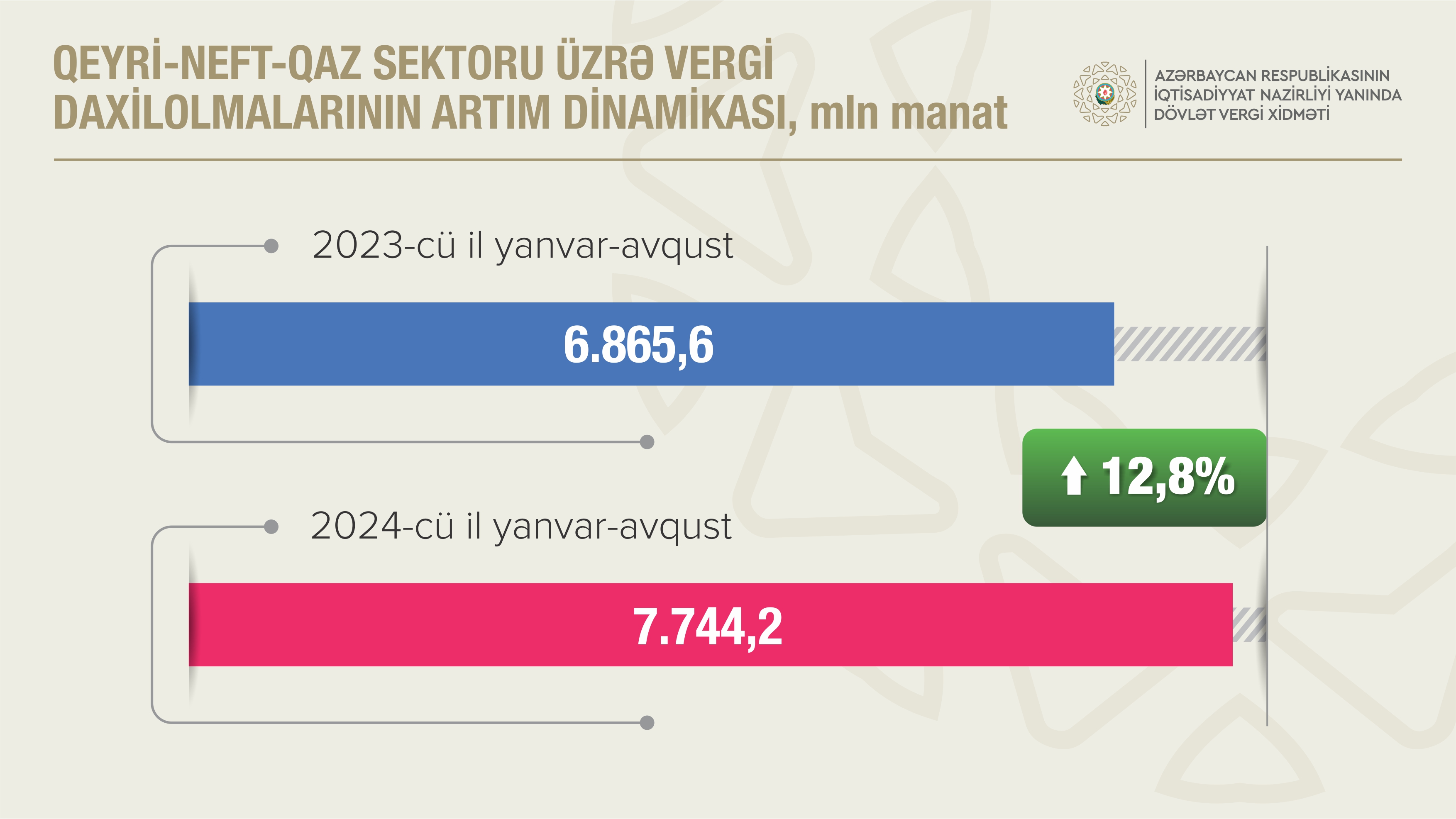 Dövlət Vergi Xidmətinin yaydığı məlumatda bildirilir ki, qeyri-neft-qaz sektorunda daxilolmalar 7 milyard 744,2 milyon manat təşkil edib, əvvəlki ilin müvafiq dövrü ilə müqayisədə bu sektordan vergi daxilolmaları 878,6 milyon manat və ya 12,8 faiz çox olub.