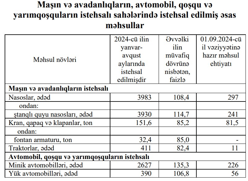 2024-сü ilin yanvar-avqust aylarında (8 ayda) Azərbaycanda 2627 ədəd və ya əvvəlki ilin müvafiq dövrü ilə müqayisədə 685 ədəd çox (35,3% çox) minik avtomobili istehsal olunub.