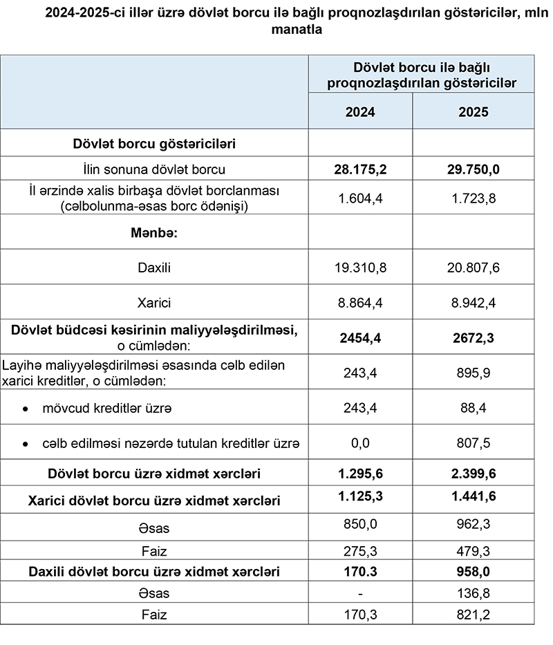 2025-ci ilin sonuna Azərbaycan Respublikasının dövlət borcunun (xarici və daxili) ümumi məbləği 30 milyard manat səviyyəsinədək və ya ÜDM-in 23 faizinə çatacağı proqnozlaşdırılır.