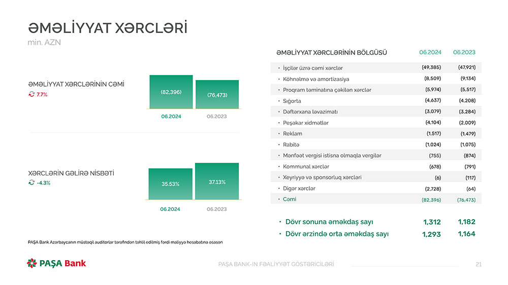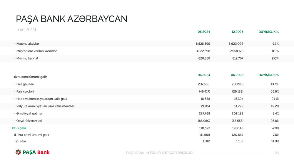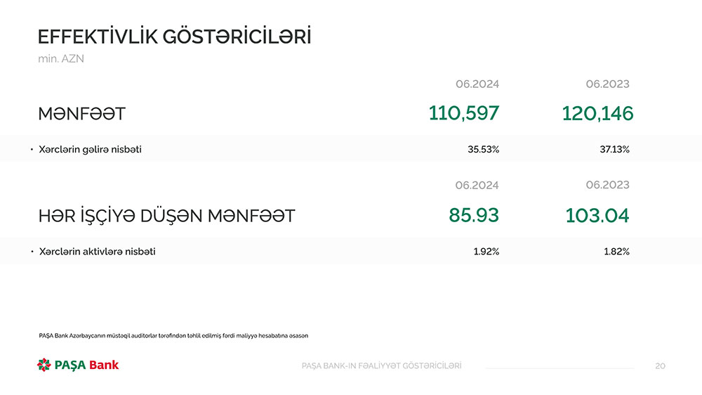 PAŞA Bankın müstəqil auditor tərəfindən təhlil edilmiş maliyyə hesabatına əsasən, Bank 2024-cü ilin birinci yarısını (yanvar-iyun) 110 milyon 597 min manat xalis mənfəət ilə başa vurub. PAŞA Bank 2023-cü ilin eyni dövrünü 120 milyon146 min manat xalis mənfəət ilə bağlamışdı.