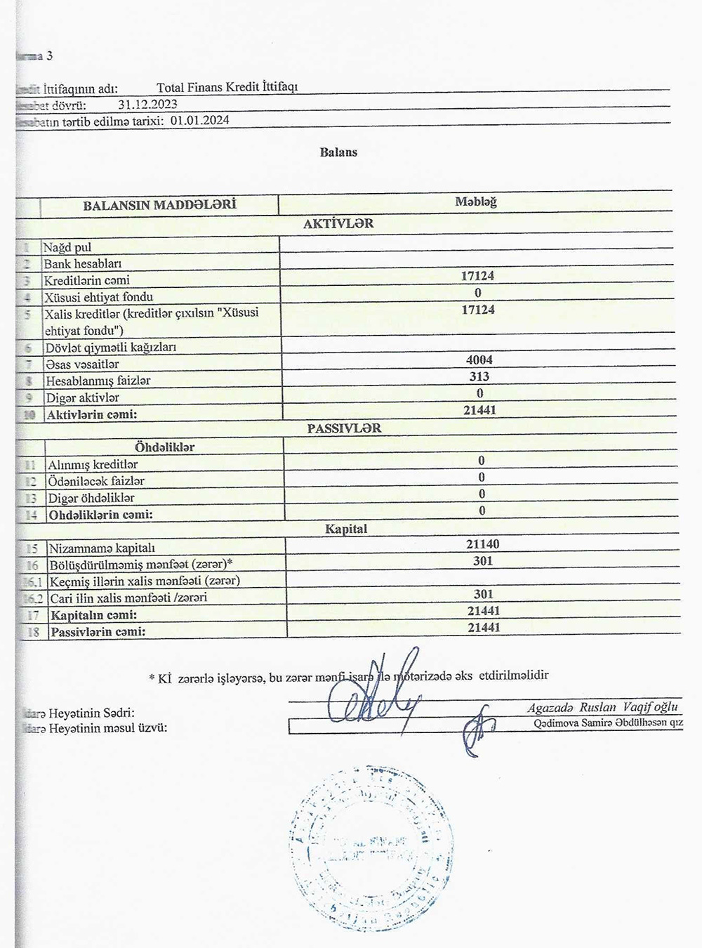 "Total Finans Kredit İttifaqı" MMC-nin 31 dekabr 2023-cü il tarixində bitən il üzrə maliyyər hesabatları