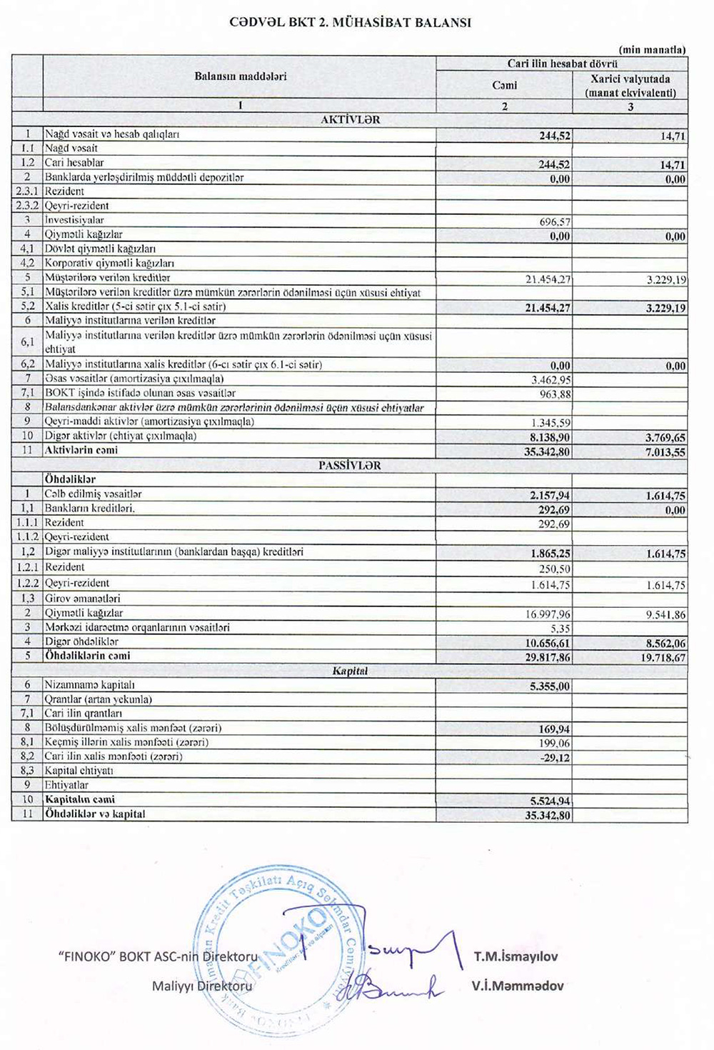 "FİNOKO" Bank Olmayan Kredit təşkilatı Açıq Səhmdar Cəmiyyəti (FİNOKO BOKT) 2024-cü ilin birinci yarısını (yanvar-iyun) 29 min manat xalis zərər ilə başa vurub. Təşkilat 2023-cü ilin eyni dövrünü 65 min manat xalis mənfəət ilə bağlamışdı.