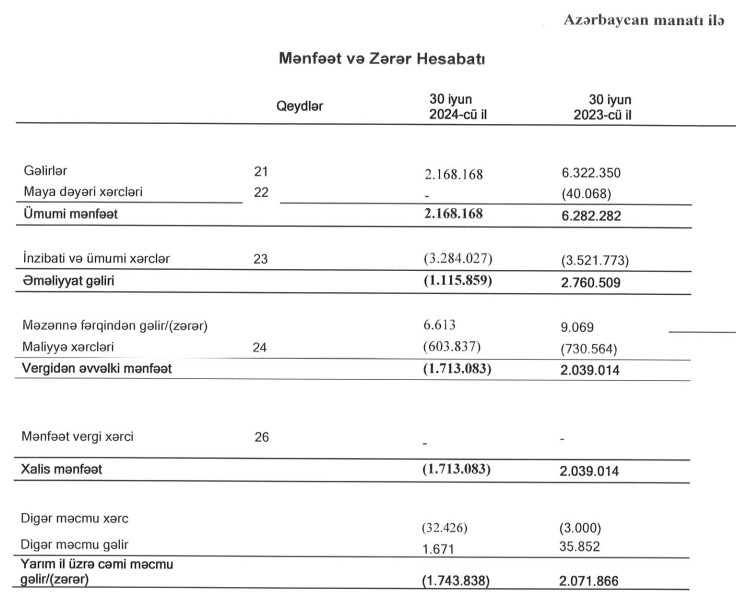 2024-cü ilin ilk 6 ayında "Diadem" ASC-nin 2 milyon 176 min manat cəmi gəlirlərinə qarşı, cəmi xərcləri 3 milyon 920 min manat olub.