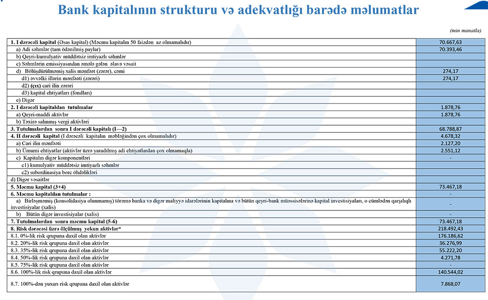 30 sentyabr 2024-cü il tarixində Bankın məcmu kapitalı 73 milyon 467 min manat təşkil edib.