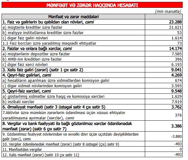 Qeyd edilib ki, cari ilin 9 ayı ərzində bankın xalis əməliyyat mənfəəti ötən ilin müvafiq dövrü ilə müqayisədə 2 dəfə artaraq 3,8 milyon manata çatmışdır. Bankın xalis faiz gəlirləri 2023-cü ilin 9 ayının yekunları ilə müqayisədə 9% artaraq 9 milyon manat, qeyri-faiz gəlirləri 24% artaraq 4.3 milyon manat, xalis qeyri-faiz gəlirləri isə 78% artaraq 2.7 milyon manat təşkil etmişdir.
