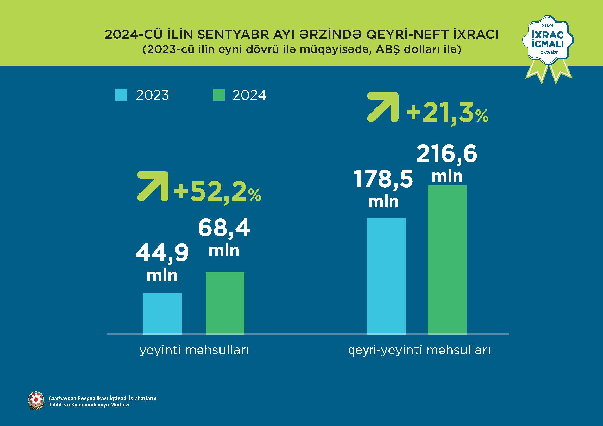 2024-cü ilin yanvar-sentyabr ayları ərzində aqrar-sənaye məhsullarının ixracı 60% artaraq 233,4 milyon ABŞ dollarına bərabər olub. Bütövlükdə aqrar və aqrar-sənaye məhsullarının birgə ixracı 17,8% artaraq 755,4 milyon ABŞ dolları təşkil edib.