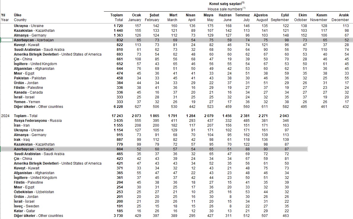 2024-cü ilin 9 ayı ərzində (yanvar-sentyabr) Azərbaycan vətəndaşları Türkiyədə 604 ev əldə ediblər.