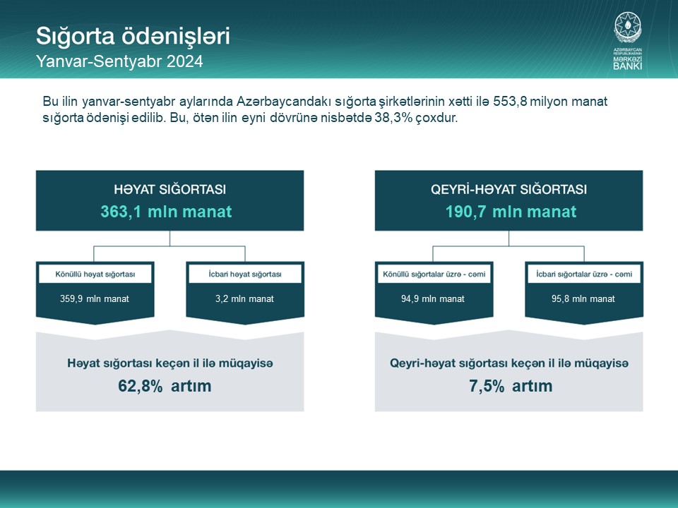 2024-cü ilin 9 ayı ərzində Azərbaycandakı sığorta şirkətlərinin xətti ilə 553,8 milyon manat sığorta ödənişi edilib. Bu, ötən ilin eyni dövrünə nisbətdə 38,3% çoxdur.