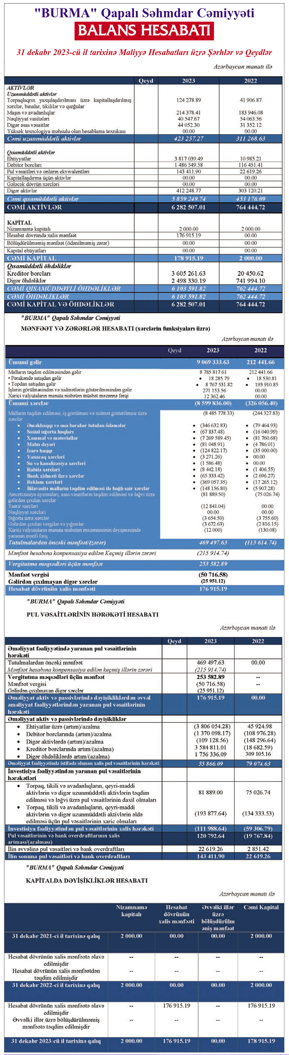 Marja.az xəbər verir ki, "Burma" şirkətinin ümumi gəlirləri 2022-ci ildə 212 min manat ikən, 2023-cü ildə 9 milyon 69 min manat təşkil edib (43 dəfəyə yaxın artıb). Ötən il Şirkətin xərcləri isə 26 dəfə artaraq 8 milyon 600 min manat olub. Şirkət 469 min manat ümumi mənfəətindən keçmiş illərin zərərini kompensasiya edib, mənfəət vergisi ödəyib.